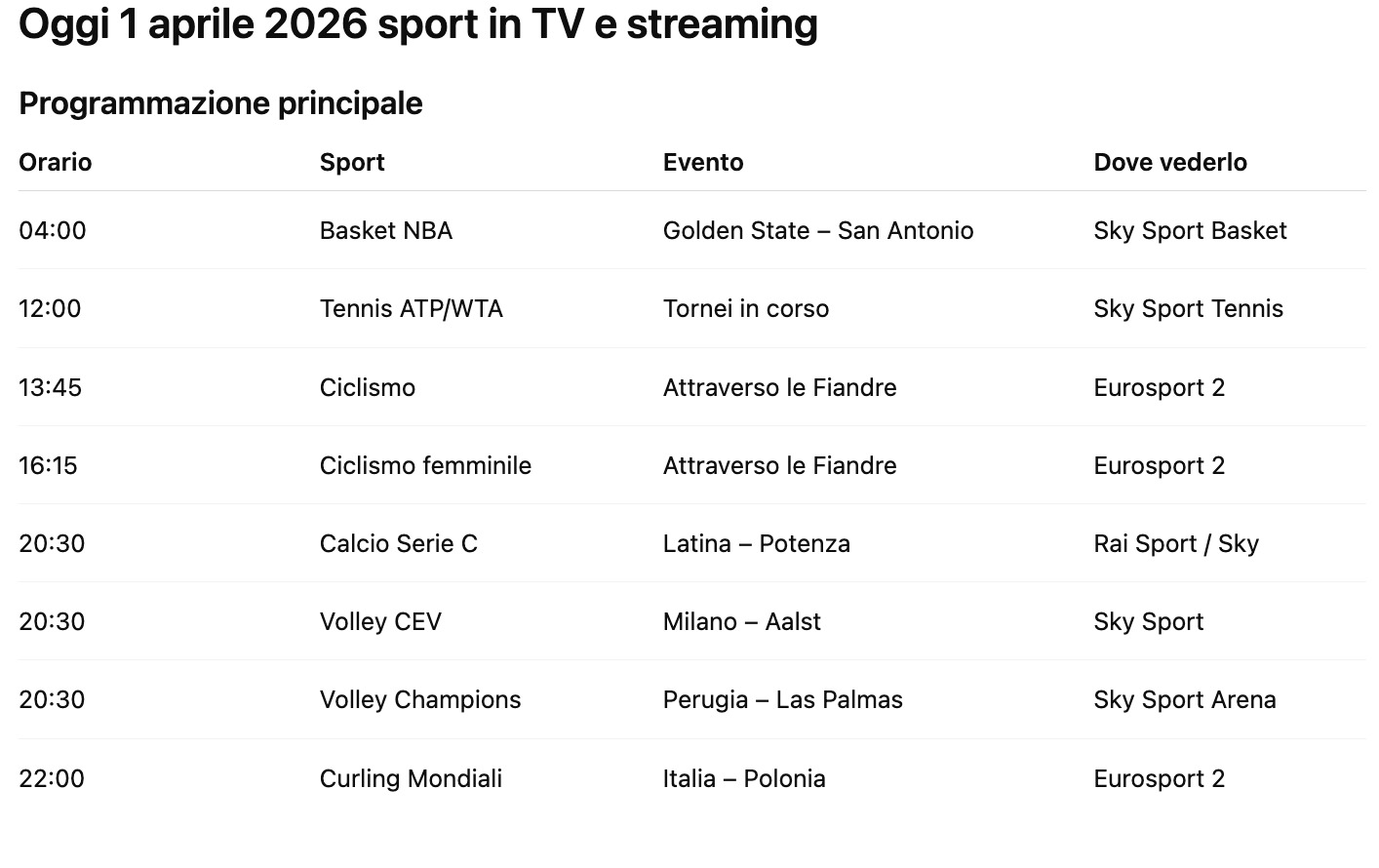 Il ciclismo apre il pomeriggio con una classica importante, mentre la sera è dominata dagli sport indoor — volley e calcio minore, ma con pubblico reale e costante.