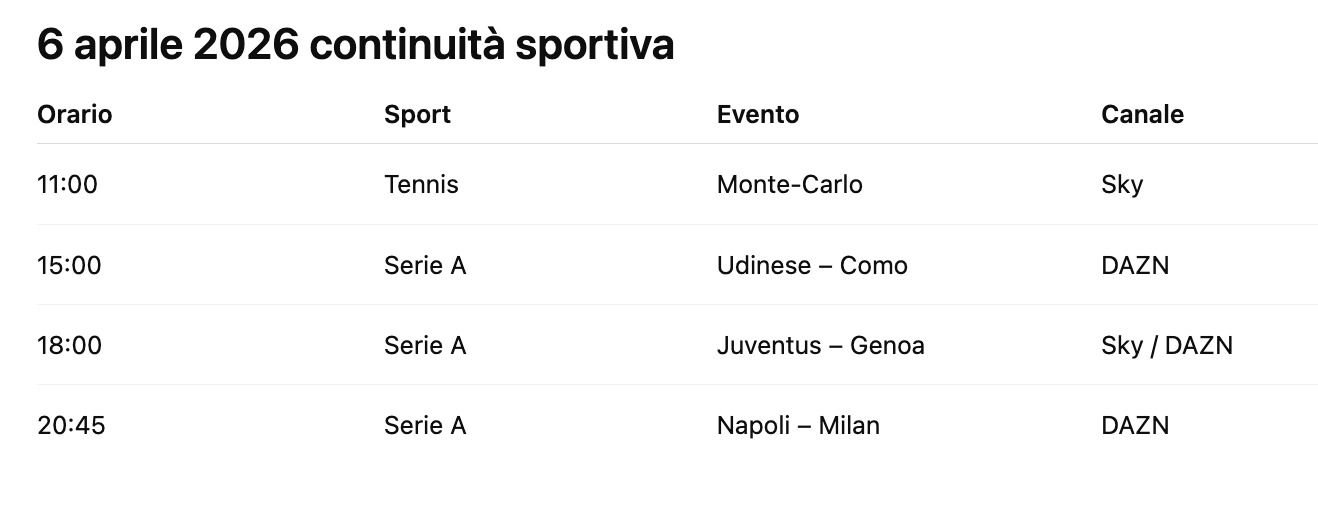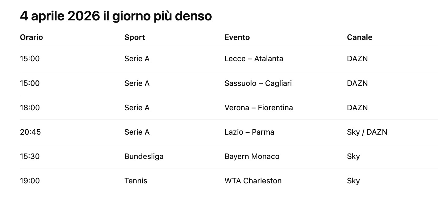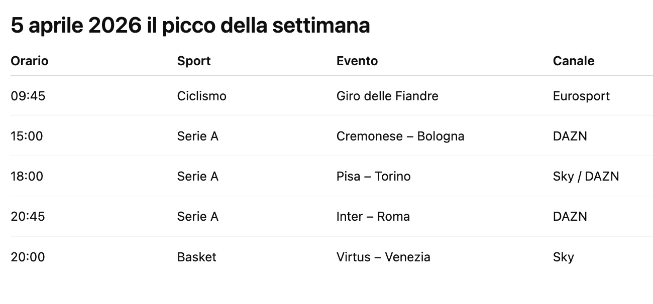 Le partite di Serie A, i tornei di tennis, le tappe ciclistiche e gli eventi internazionali prolungano il ritmo. Non si chiude più la domenica sera — si continua.